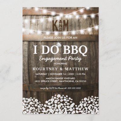 Rustic "I DO BBQ" couple engagement party invitations featuring a country barn wood barrel background twinkle string lights babys breath flowers wedding engagement ring your monogram and a couples shower celebration template that is easy to personalize. myBabyShower