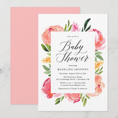 Chic and elegant baby shower invitations featuring vibrant watercolor flowers in shades of pink and peach complimented by beautiful calligraphy. Personalize the floral baby shower invitations by adding the mother-to-be's name and shower details. myBabyBloom