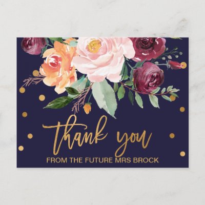 This autumn floral thank you postcard is perfect for a fall wedding. The design features a stunning bouquet of blush orange peach and marsala burgundy flowers with faux gold foil typography and confetti. Personalize the front of the card with a short message. Personalize the back with a longer thank you message. Alternatively leave the thank you message template section on the back blank to hand write a thoughtful personalized note on each postcard after they arrive. These postcards can be used for the bridal shower wedding or any special event.Please Note: This design does not feature real gold foil. It is a high quality graphic made to look like gold foil. myBabyBloom