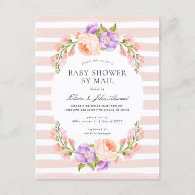 Whether you can't gather for a party due to coronavirus social distancing guidelines or long distance family and friends are just too far away this beautiful Baby Shower by Mail invitation will allow loved ones to celebrate your new baby from anywhere. This pretty botanical design features a watercolor frame of peach and lavender flowers on a blush striped background. Use the design tools to customize the text edit the fonts and colors or add your own photos to create an elegant spring floral baby shower invitation. myBabyBloom