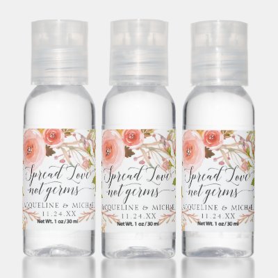 Ad: Fall Floral Gold Pink Peach Rose Script Wedding Hand Sanitizer