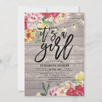 Ad: Baby Shower Chic Flowers String Lights Rustic Wood Invitation