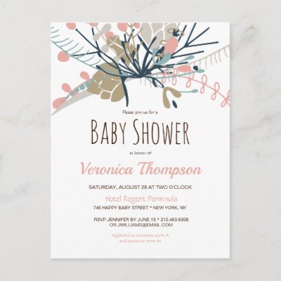 Soft and pretty pastel colors with coral mint teal and brown adorn the top of this baby shower invitation postcard in a botanical style with berries and pine cones. This trendy typography is customizable or keep this fun style as it is for your convenience. Perfect gender neutral invitation for a either baby boy or baby girl shower. myBabyShower
