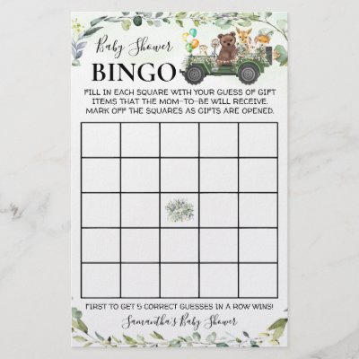 Woodland Forest Animals Baby Shower Bingo Game. Change wording to the design. For additional customization (change other wording font color font style) click on personalize scroll down and click on the link "click to customize further". ** Check collection for all matching designs ** HOW TO PLAY: Guests fill in the blank squares with their guesses of gifts received. When the Mom-to-be opens her gifts guests mark out the squares with the correct answer. The first to have five correct answers in a row wins! myBabyShower